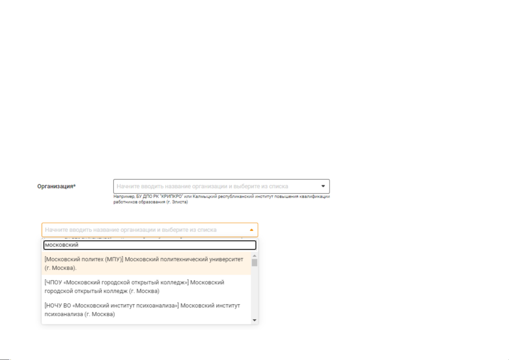 - при регистрации из сети организации, НЕ внесенной в настройки образовательной платформы или при регистрации из частной сети (из дома)пользователю необходимо выбрать свою организацию (учебное заведение) из списка, начав печатать еѐ полное или сокращѐнное название.