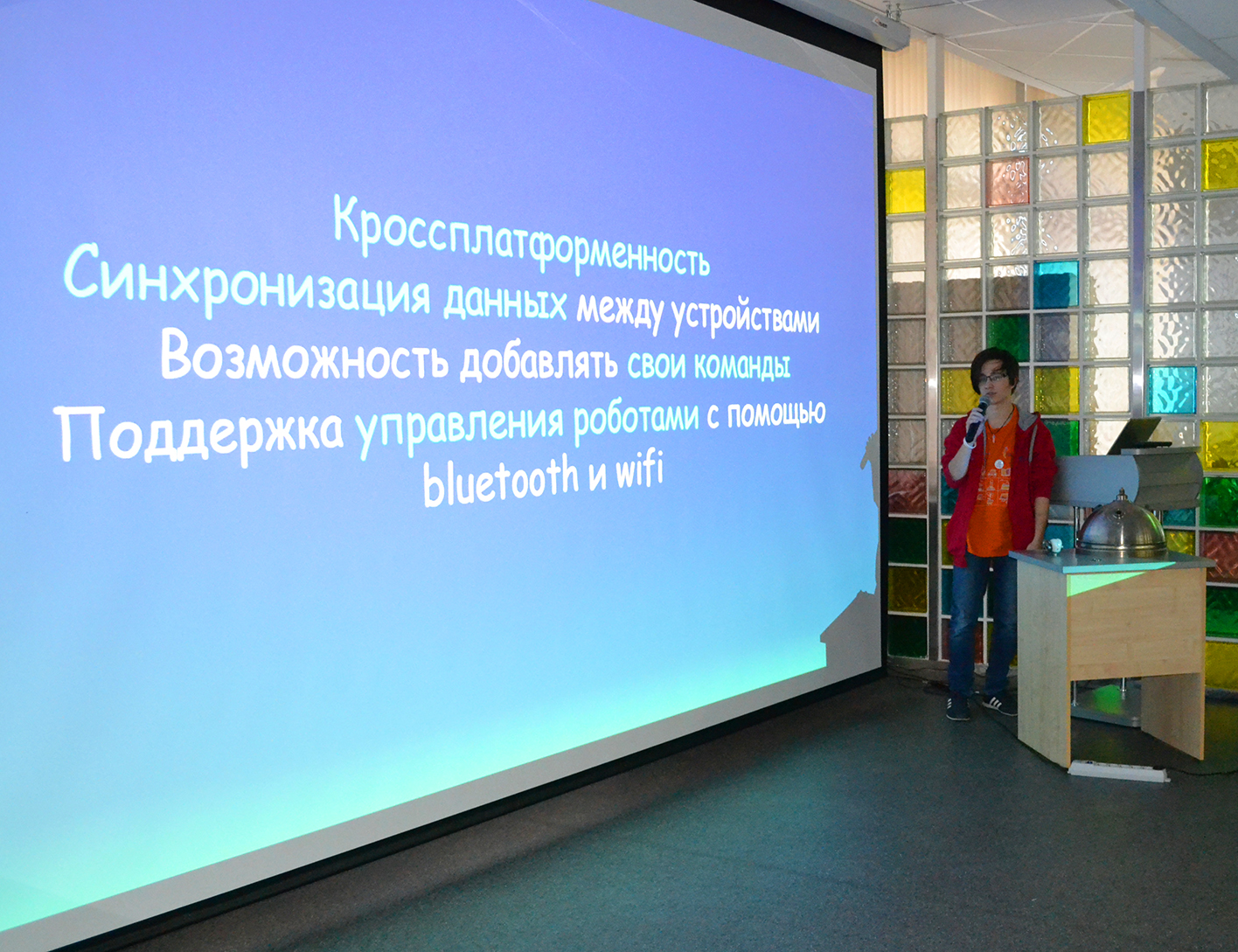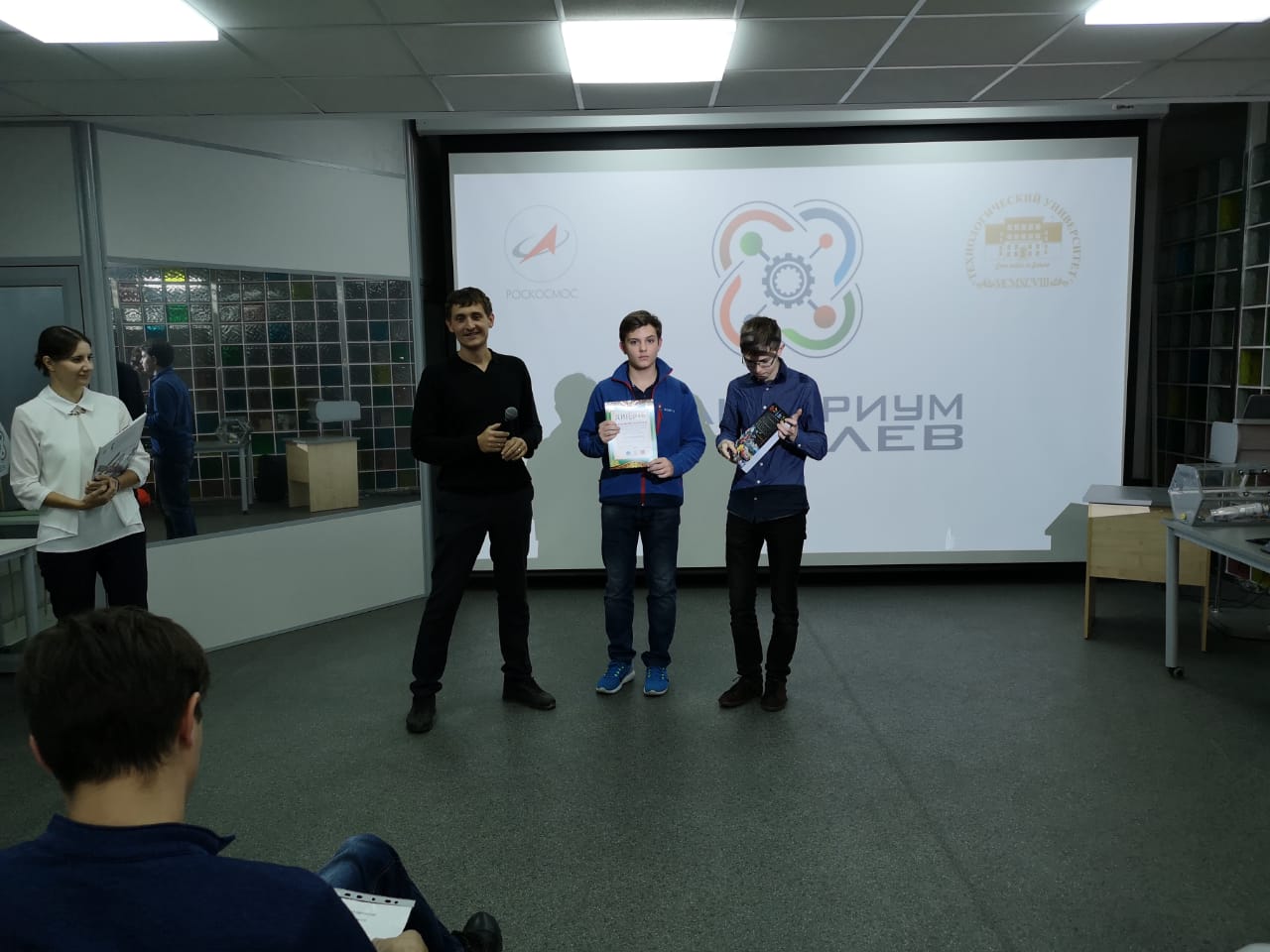 9 проектов оценивали представители Совета молодых учёных и специалистов г.о. Королёв. В результате победил проект «Робот-транспортёр» кванторианцев Никиты Анисимова, Михаила Терентьева и Александра Кузенкова.