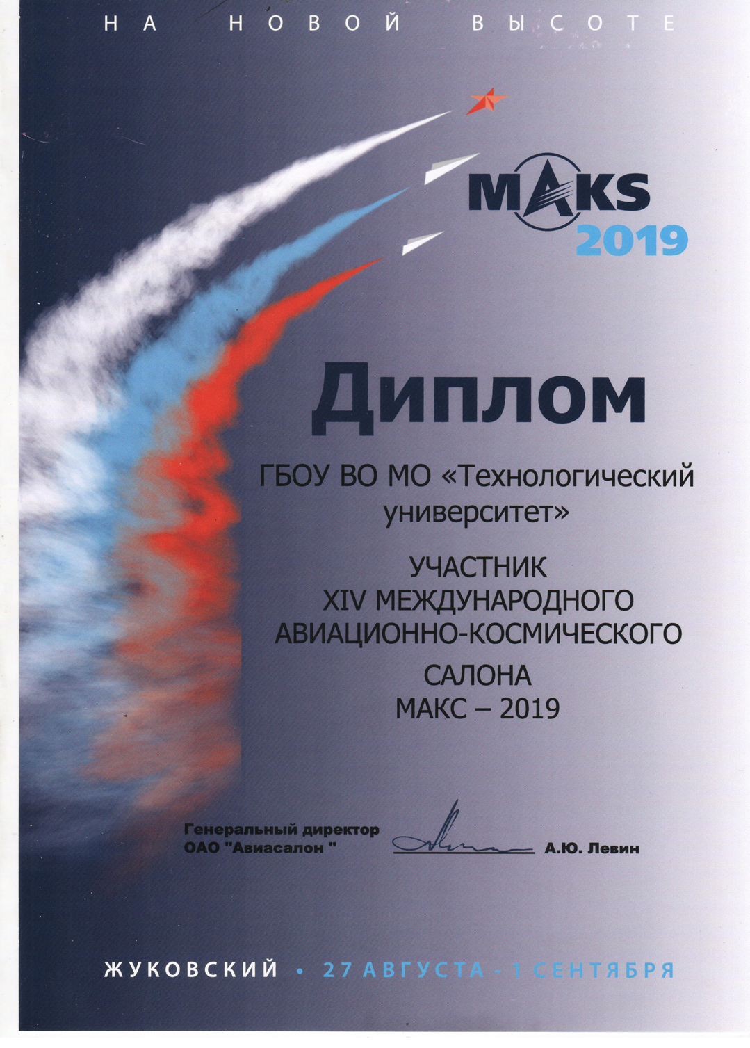По итогам работы Международного авиационно-космического салона МАКС-2019, Технологический университет награждён дипломом участника салона.