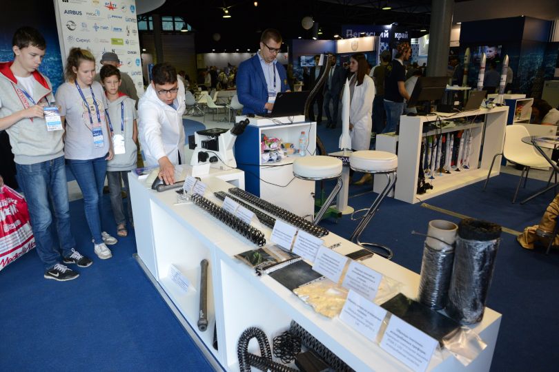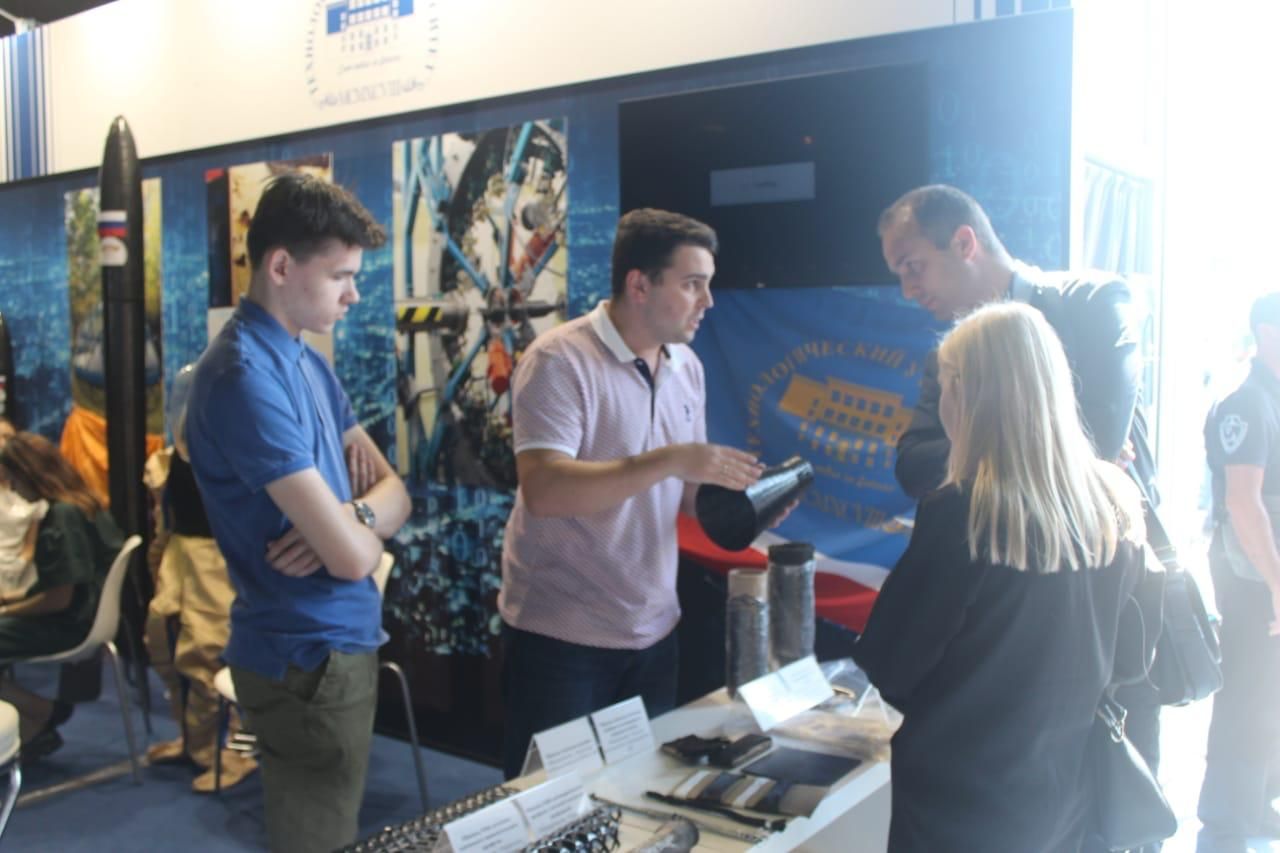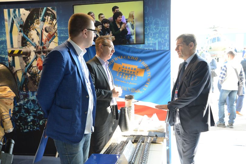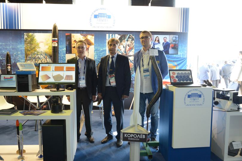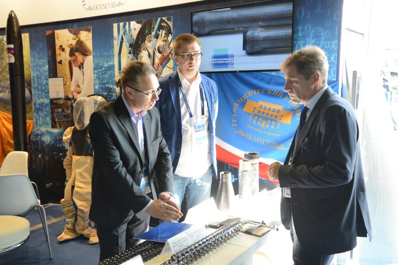 На стенде Технологического университета представлены разработки Инжинирингового центра «Высокотемпературные композиционные материалы», созданного совместно с АО «Композит». Посетители авиасалона могут увидеть полный цикл создания перспективных материалов и изделий из композитов для различных сфер промышленности, в том числе образцы изделий производства Инжинирингового центра, в частности системы крепления, трубы различного диаметра из композитных материалов для обеспечения жизнедеятельности летательных аппаратов и ракет.