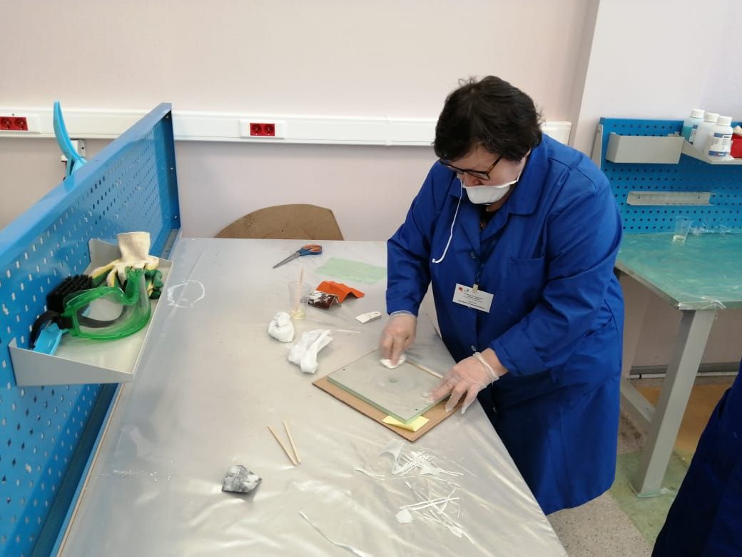 А участники компетенции «Технологии композитов», которая базируется в Инжиниринговом центре Технологического университета, уже сегодня начали соревноваться в профессиональном мастерстве. Их задание заключалось в ремонте композитного изделия – проверке комплектации, зачистке панели, укладке стекловолокна в отверстие, заливе эпоксидной смолы, контроле качества заполнения отверстия, установке панели, нанесении слоя эпоксидной смолы, раскройке стеклоткани в размер отверстия с заданным припуском. Главным экспертом компетенции выступил сотрудник Инжинирингового центра Владимир Перевезенцев.